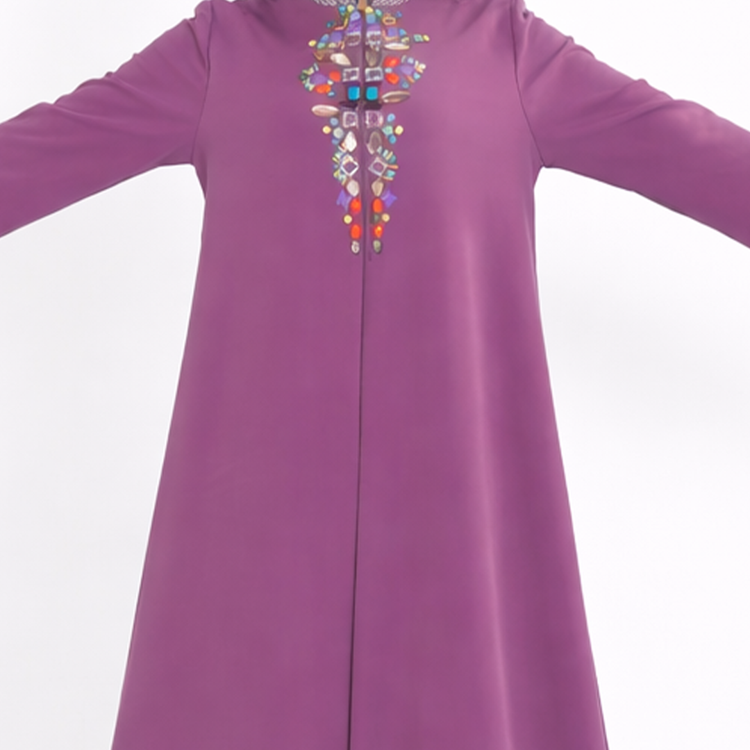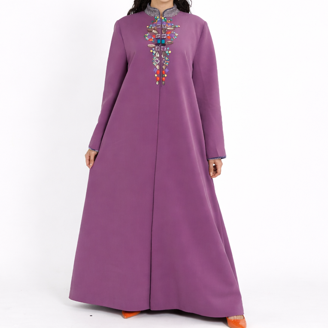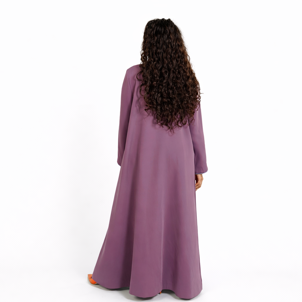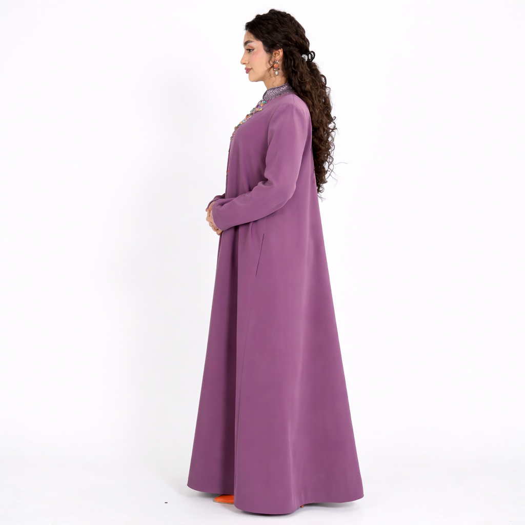 Gracefully refined, this statement abaya by Ms Coquette is designed in a rich mauve tone, enhanced with intricate hand-applied embellishment at the neckline. The clean, flowing silhouette allows the detailing to take center stage, creating a balance of softness and sophistication. Elegant yet effortless, this piece is designed for occasions where quiet luxury speaks loudest.