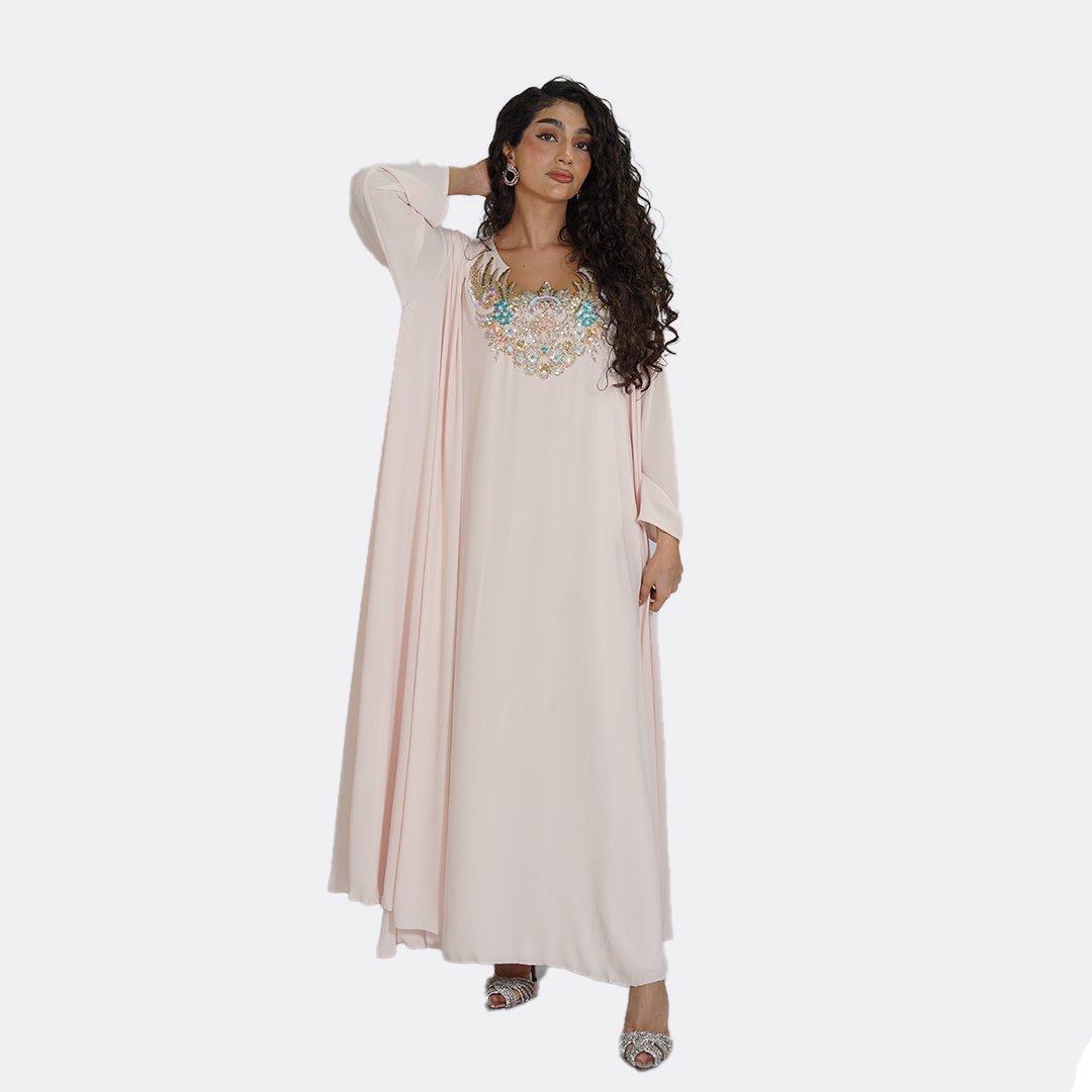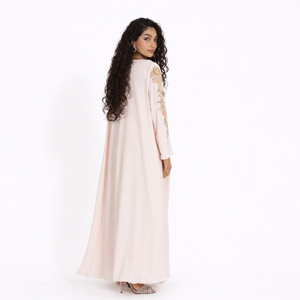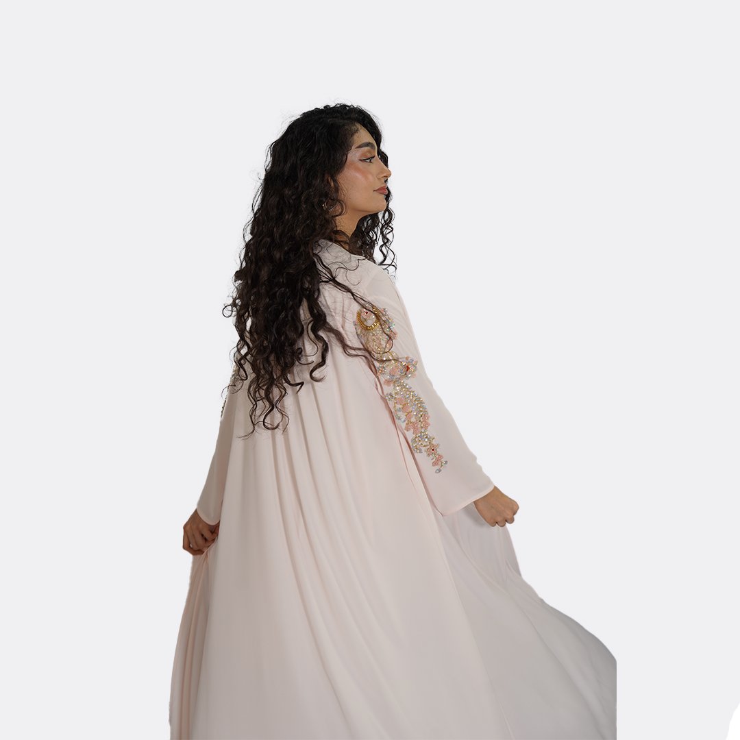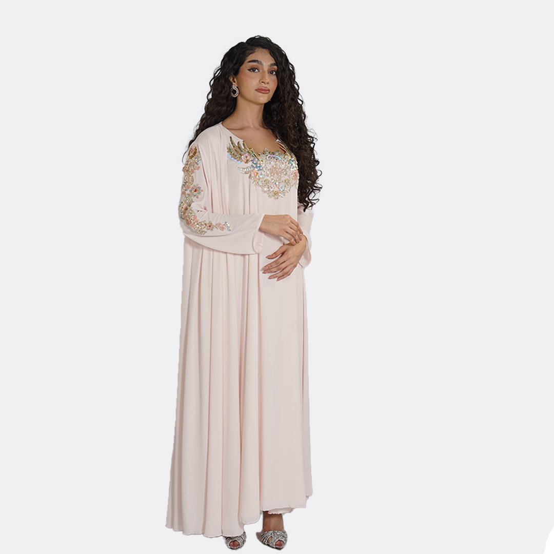 Ethereal and delicately adorned, this elegant abaya by Ms Coquette is designed in a soft blush tone that flows effortlessly with every movement. The silhouette is elevated by intricate hand-applied embellishments across the neckline and sleeves, creating a subtle shimmer that catches the light with grace. Light, fluid, and romantic, this piece is designed for special occasions where elegance feels effortless.
