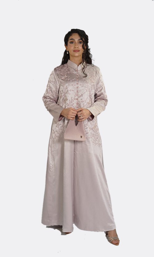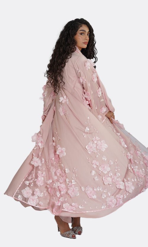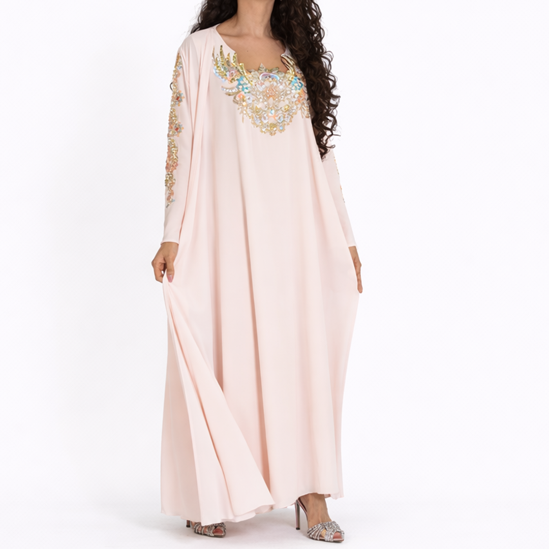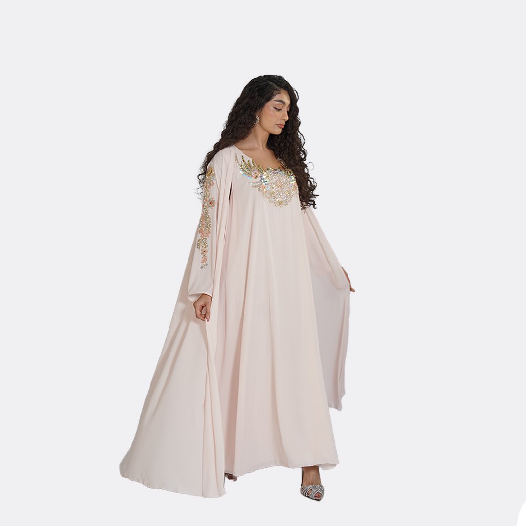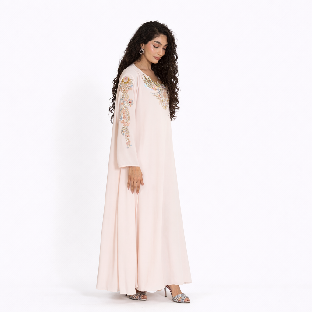 Ethereal and delicately adorned, this elegant abaya by Ms Coquette is designed in a soft blush tone that flows effortlessly with every movement. The silhouette is elevated by intricate hand-applied embellishments across the neckline and sleeves, creating a subtle shimmer that catches the light with grace. Light, fluid, and romantic, this piece is designed for special occasions where elegance feels effortless.