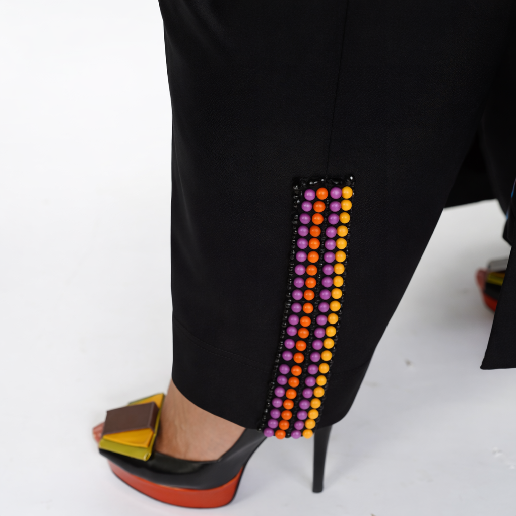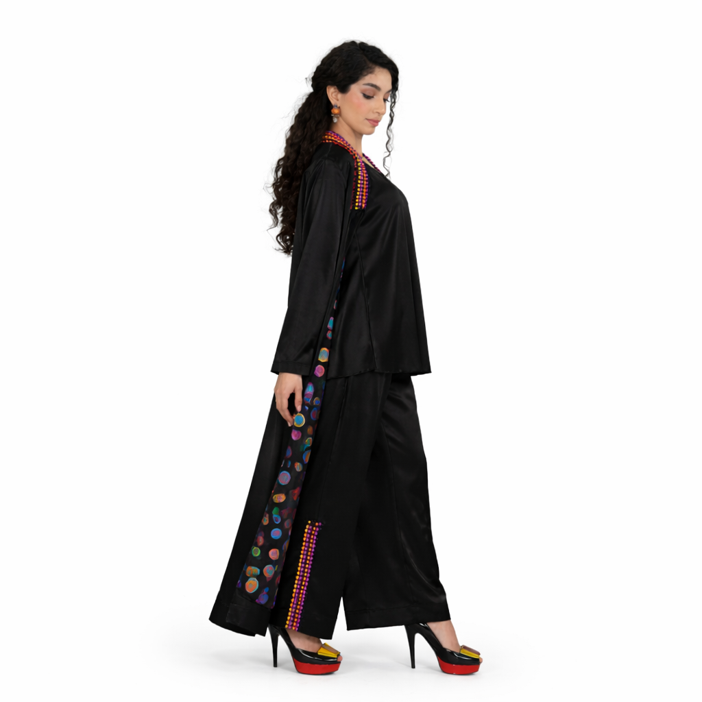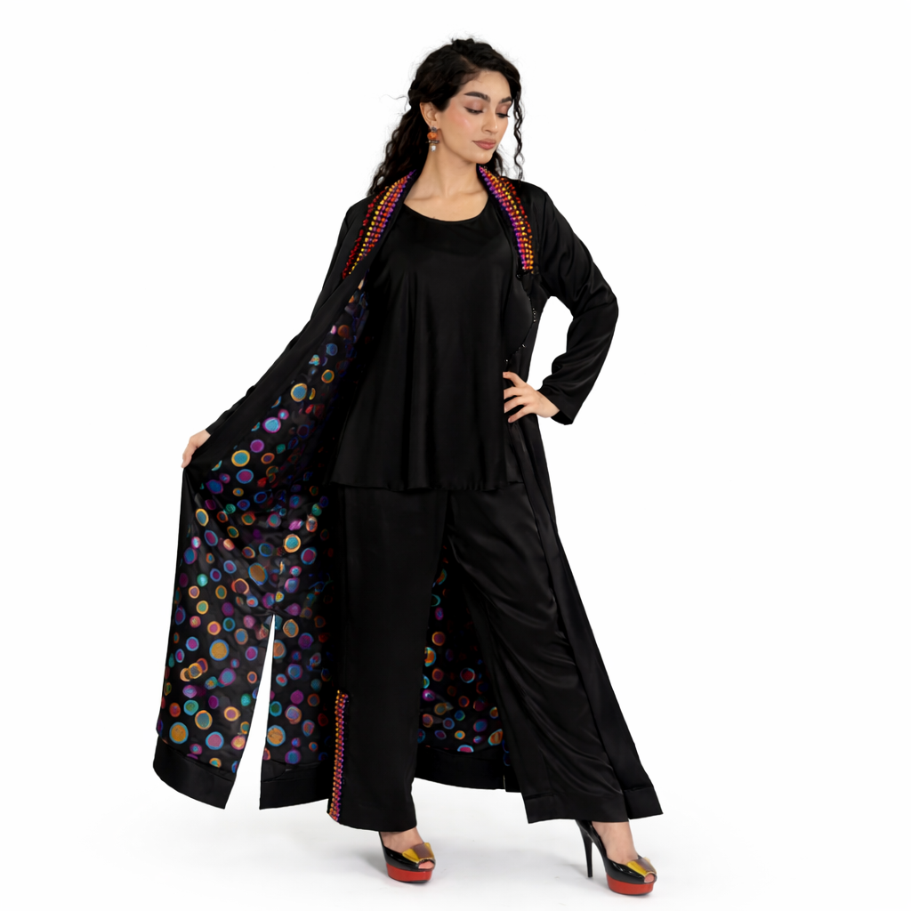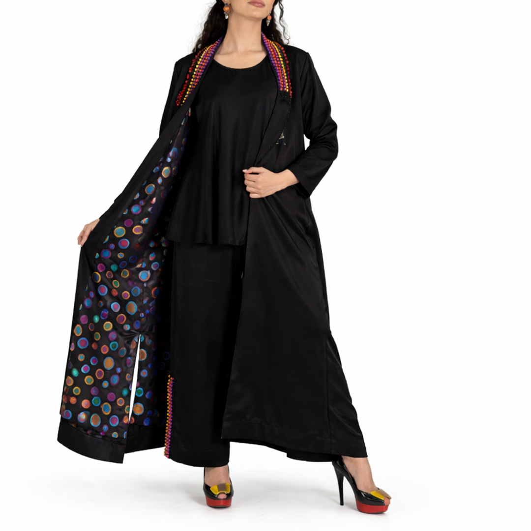 Bold yet refined, this contemporary abaya by Ms Coquette is designed in fluid black and accented with vibrant hand-beaded detailing along the neckline and cuffs. A striking contrast lining with a playful circular motif adds depth and movement, revealing character with every step. Confident, expressive, and effortlessly chic, this piece redefines modern elegance with an artistic edge.
