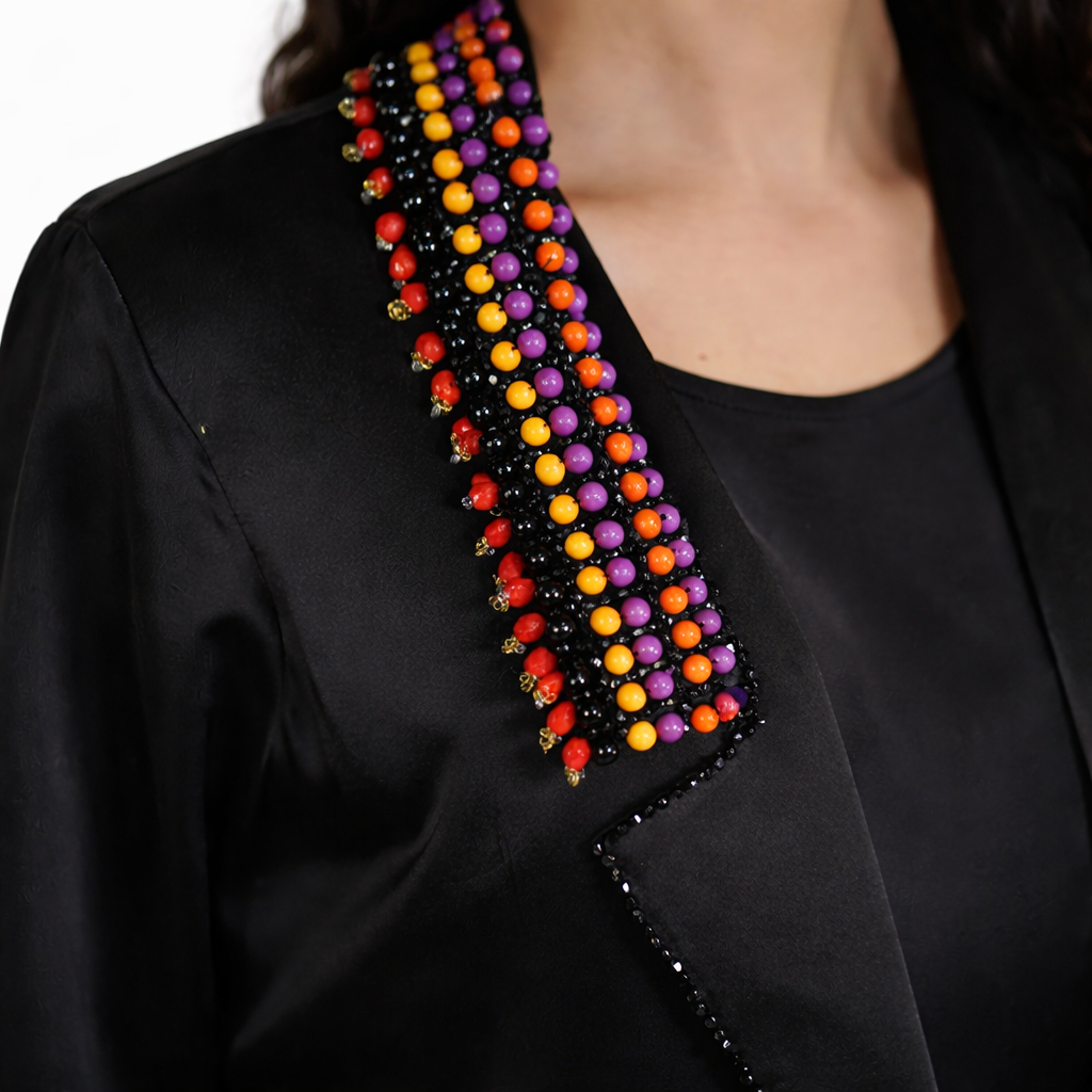 | Design | Hand-beaded neckline and cuff detailing with statement inner print |