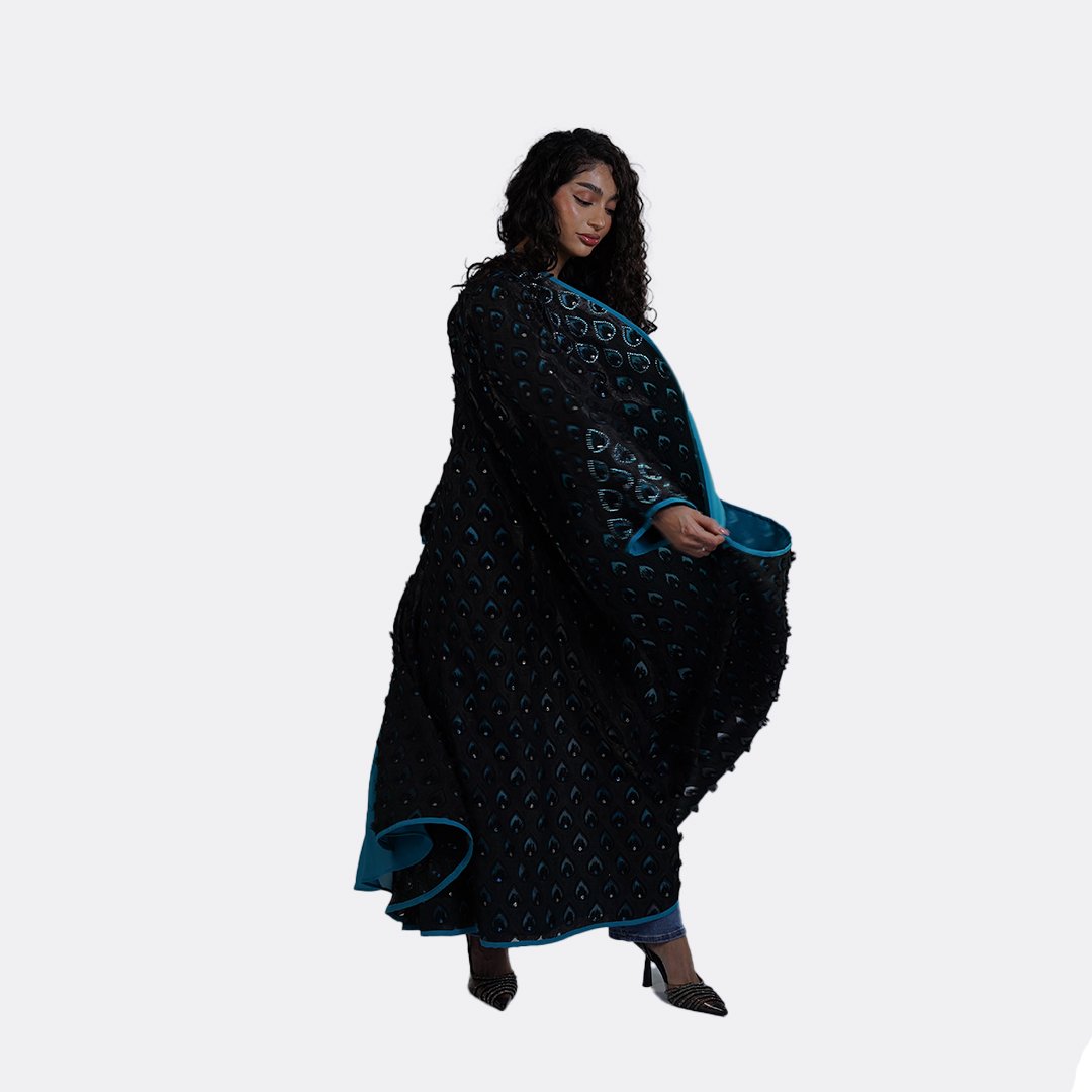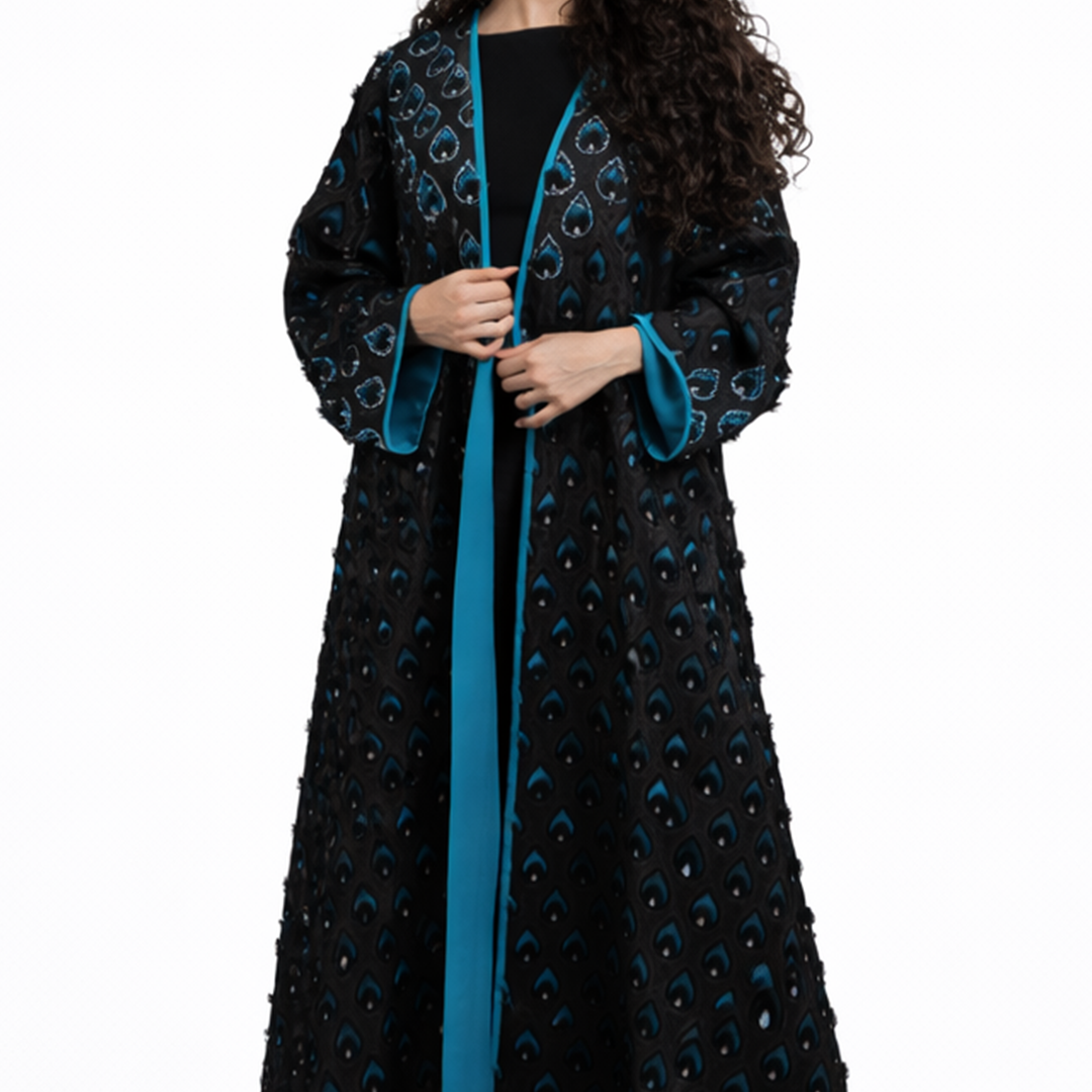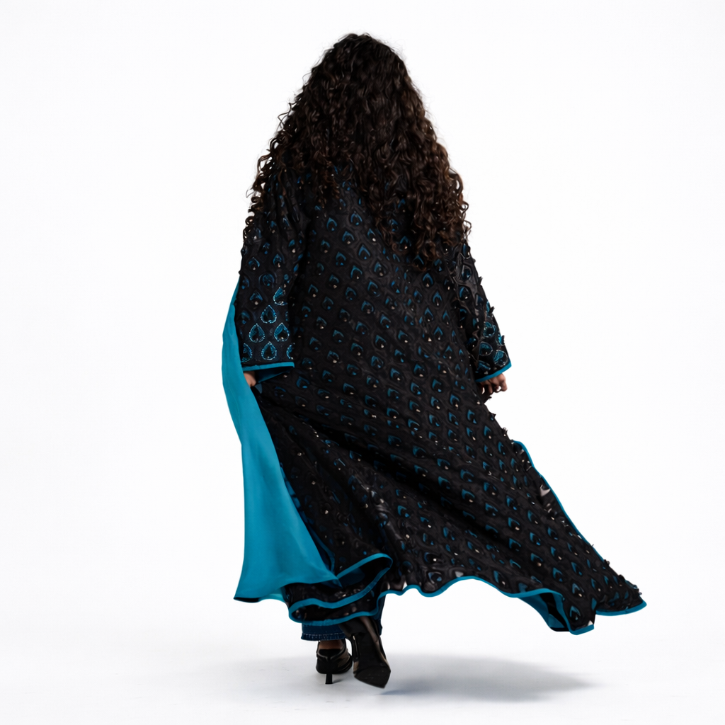 A study in understated luxury, this Ms Coquette abaya is defined by its rich black tone and subtle teal contrast. The textured outer layer adds depth and sophistication, while the fluid inner panel creates an elegant, elongated silhouette. Designed for effortless refinement, this piece transitions seamlessly from day to evening with quiet confidence.