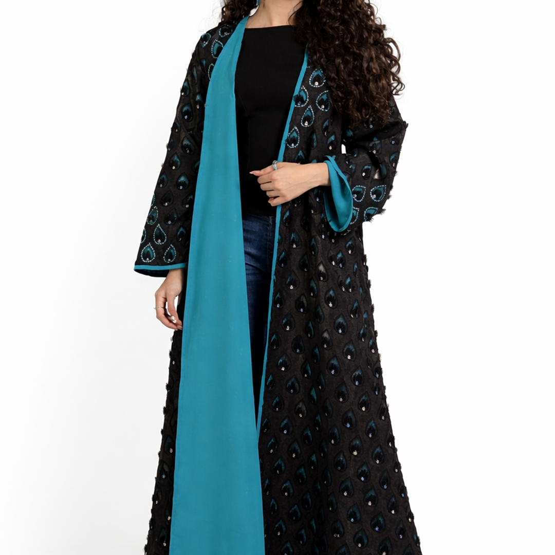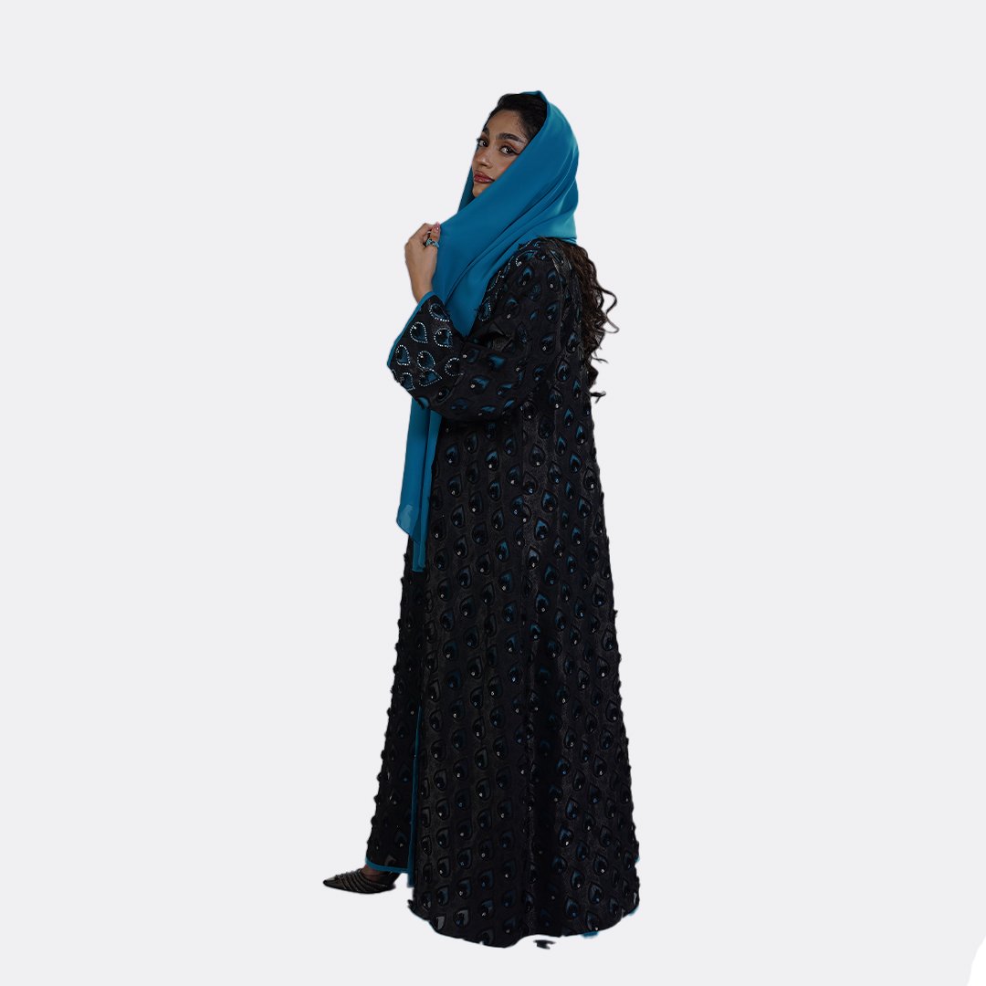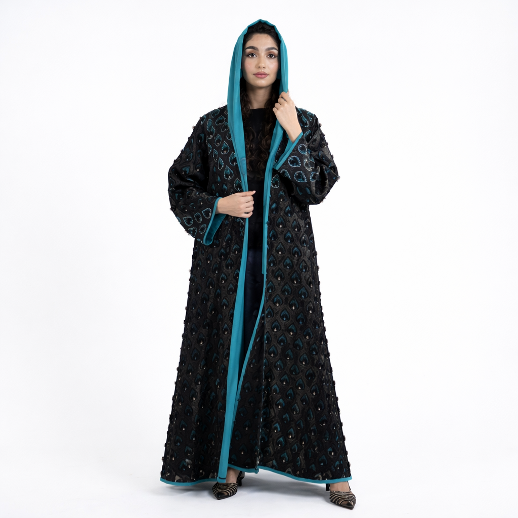 A study in understated luxury, this Ms Coquette abaya is defined by its rich black tone and subtle teal contrast. The textured outer layer adds depth and sophistication, while the fluid inner panel creates an elegant, elongated silhouette. Designed for effortless refinement, this piece transitions seamlessly from day to evening with quiet confidence.